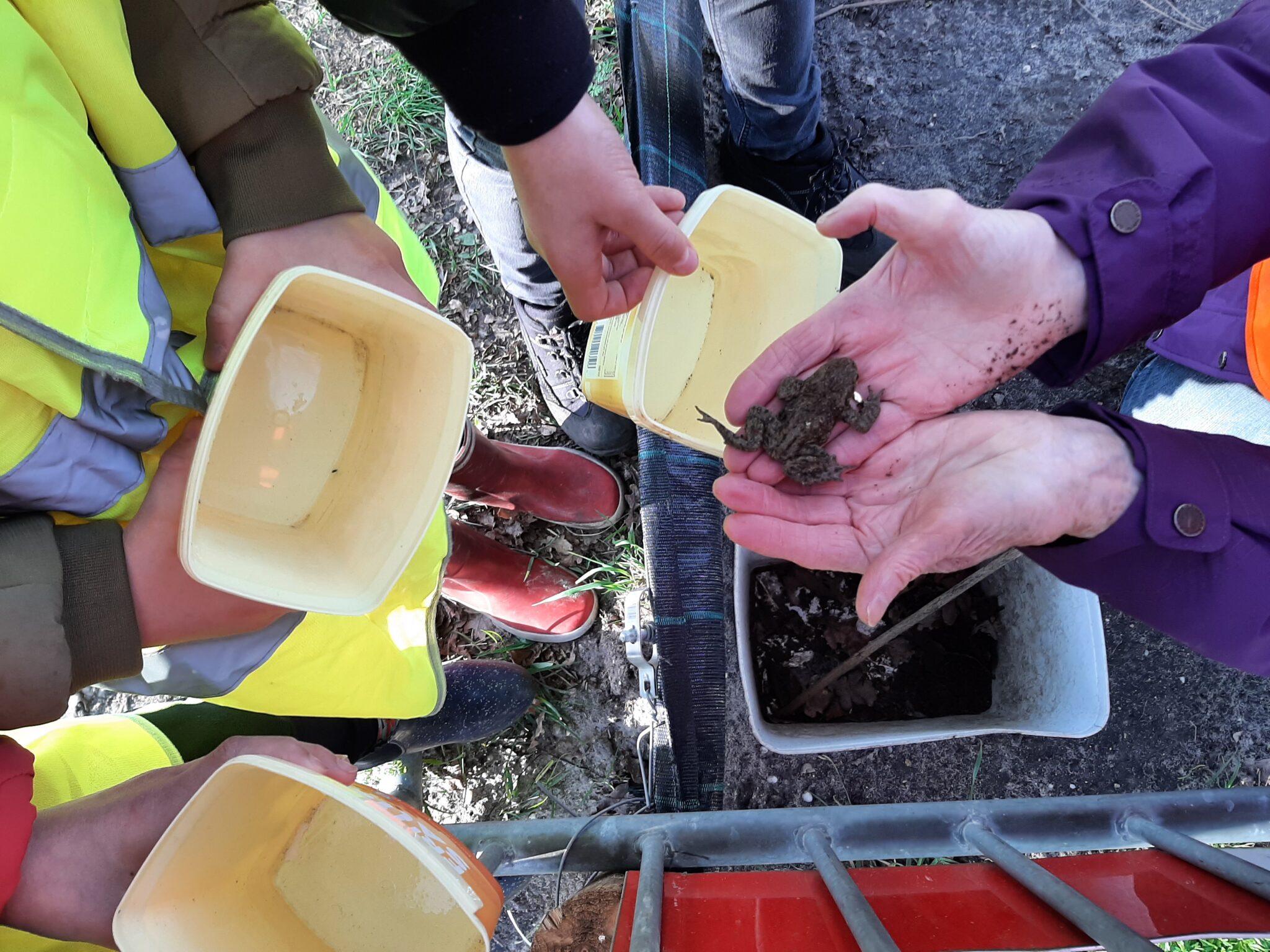 Na het tellen konden we de padden, een paar kikkers en een aantal salamanders de oversteek naar het water helpen maken.