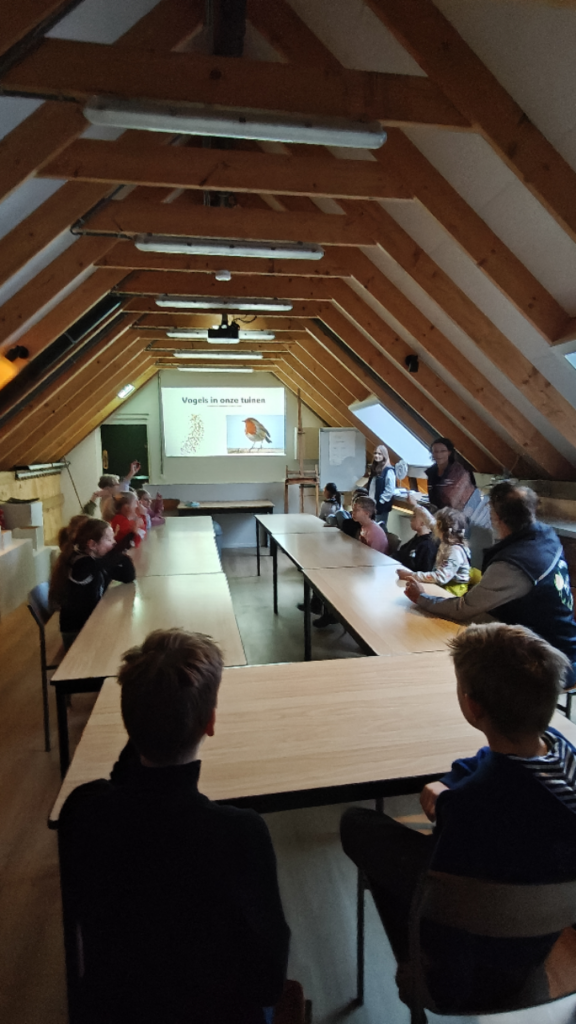 Boven stond alles klaar voor een presentatie over tuinvogels. Marleen vertelde wat de meest voorkomende tuinvogels zijn. Waar je op let om vogels te onderscheiden (zoals o.a. grootte en kleur). Wat de verschillen zijn tussen mannetjes en vrouwtjes. Maar ook dat je aan de vorm van de snavel kan zien wat vogels eten. Of ze bessen, wormen of insecten eten of juist zaden.