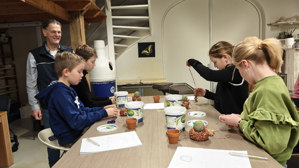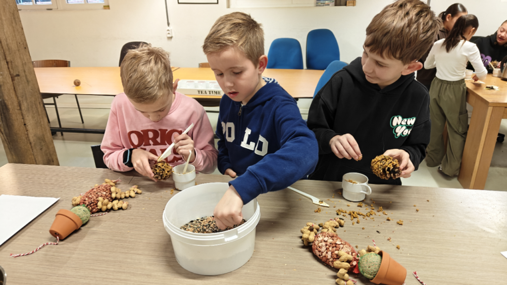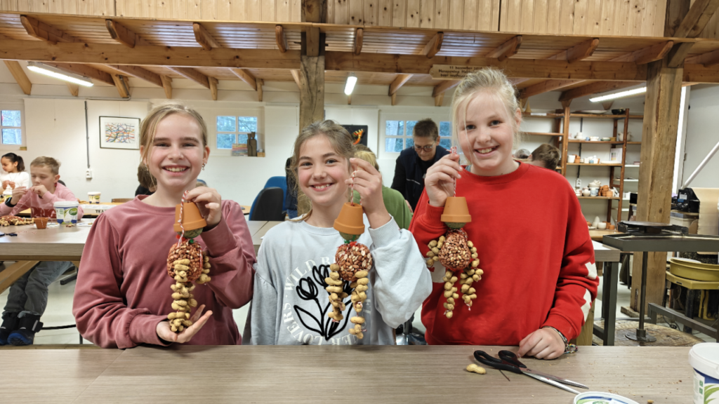Het bleek een leuke en soms ook uitdagende klus. Een glas ranja met een koekje erbij waren dan ook zeer verdiend. Als extraatje om te maken mochten de kinderen ook nog een dennenappel insmeren met vogelpindakaas en die vervolgens door zaden heen rollen. Een hele simpele manier om leuke hangers voor in de tuin te maken. Hangers waar vogels dol op zijn.
