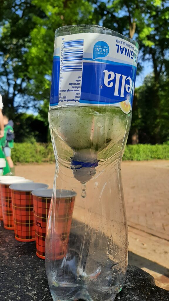 Terug bij de Hobbyboerderieje startten we met een experiment. We gingen het water filteren. Daarvoor hadden we verschillende materialen. Onder andere watten, koffiefilterzakjes, nylonkousjes, zand, grind, norit en lapjes stof. Eerst probeerden we uit wat het verschil in filtratie was tussen de verschillende materialen. Uiteindelijk zochten we de ultieme filtercombinatie en werden de verschillende materialen gecombineerd.