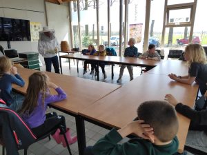 Zaterdag 15 april hadden we imker Hans uitgenodigd. Hans houdt al meer dan 50 jaar bijen en weet er dus heel veel van te vertellen. Hij had veel attributen van een imker bij zich en hij stelde zich voor in zijn imkerpak, wat meteen de aandacht van de kinderen trok. Jammer genoeg waren er wat technische problemen, we misten de usb kabel. De kinderen moesten het nu doen met het scherm van de laptop van Hans in plaats van het mooie nieuwe scherm van het MEC.