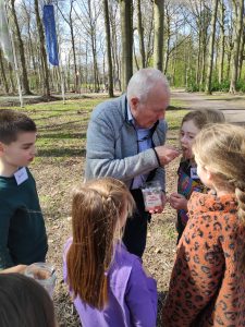 Tijdens de pauze gingen we even naar buiten om een tikspel te spelen, als beloning kregen de kinderen een lepeltje honing van de bijen van Hans. Iedereen was het erover eens dat zijn honing veel lekkerder was dan die uit de winkel. Zijn bijen moeten er dan ook heel hard voor werken. Om een potje honing te vullen, moeten de bijen een afstand vliegen net zo ver als de omtrek van de aarde.