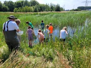 Zaterdag 10 juni gingen we naar de Kapelberg om in de poeltjes waterdiertjes te scheppen. Ondanks de hoge temperatuur waren er toch nog 15 kinderen gekomen. We kregen hulp van Kees van de amfibieën- en vissenwerkgroep, hij had al veel voorbereidend werk gedaan. Zo konden de kinderen in het begin al de Amerikaanse rivierkreeft zien.