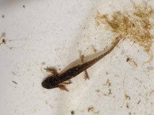 Een paar kinderen wilden precies weten wat we allemaal gevangen hadden. Op de lijst stonden o.a.: stekelbaarsje, kikker, salamander, bootsmannetje, vlo, wants, posthoornslak, libellen- en jufferlarve enz.