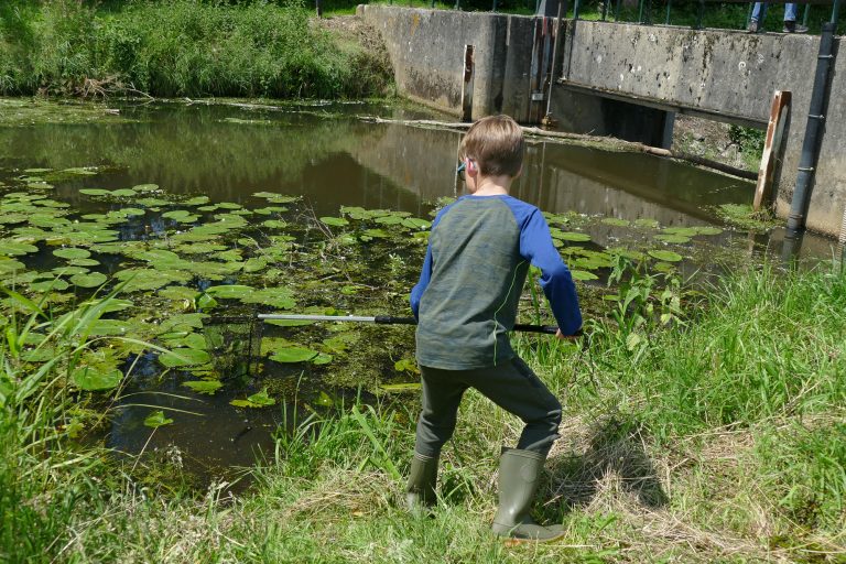 11 juni heeft de jeugdnatuurgroep meegedaan met de landelijke slootjesdag. Het is altijd weer een uitdaging om een gebiedje te vinden waar de kinderen veilig kunnen scheppen. Deze keer hadden we voor het retentiebekken bij de Molenbeek gekozen. Hoewel dit een geliefde activiteit is bij onze jeugd, waren er deze keer maar 7 kinderen aanwezig. Het ledenaantal is na corona dan ook sterk gedaald. Deze 7 gingen enthousiast aan de slag. We hadden ze in 3 groepjes verdeeld, zodat iedereen voldoende ruimte had om te scheppen. Na de pauze werd er gerouleerd. Het was een geslaagde middag. We hebben ongeveer 15 verschillende soorten diertjes geschept, waaronder bloedzuiger, poelslak, zoetwaterpissebed, tuinslak, stekelbaars, larven van libellen enz. Ook hebben we de gaffelwaterjuffer gespot en dat is best bijzonder.
