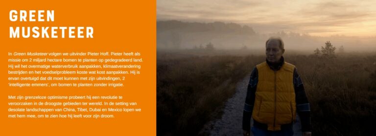 In Green Musketeer volgen we uitvinder Pieter Hoff. Pieter heeft als missie om 2 miljard hectare bomen te planten op gedegradeerd land. Hij wil het overmatige waterverbruik aanpakken, klimaatverandering bestrijden en het voedselprobleem koste wat kost aanpakken. Hij is ervan overtuigd dat dit moet kunnen met zijn uitvindingen, 2 ‘intelligente emmers’, om bomen te planten zonder irrigatie.