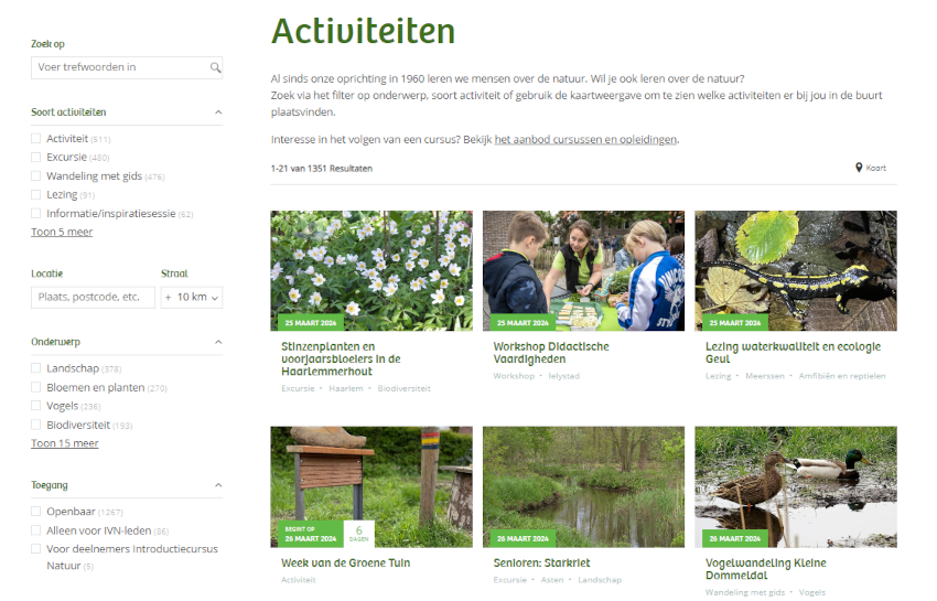 Op de landelijke website van het IVN zit een handige selectiemodule waarmee je alle activiteiten van alle IVN afdelingen van Nederland kunt selecteren op o.a. datum of type activiteit. Selectiemodule >>
