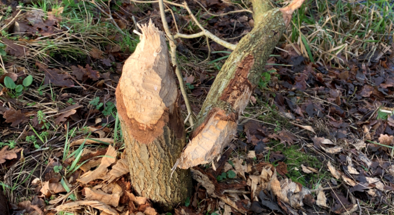 Op onze rondgang door het gebied kwamen we ook diverse verse sporen tegen van reeën en de das en verder nog een vers om geknaagde eikenboom door de bever. Door de vele regen was het zeer nat in het gebied en dat betekende soms zoeken naar doorwaadbare plekken om de excursie te voltooien en soms wat aanpassingen maken op de planning.