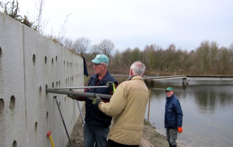In april 2018 is de oeverzwaluwwand klaar voor gebruik! De jarenlange ervaring van Henk Steenbakkers als landmeter kwam weer eens goed van pas. Het plaatsen van de loodzware elementen met in totaal 144 nestgaten voor de oeverzwaluw was namelijk een nauwkeurig klusje. Dankzij een grondige voorbereiding en een superstrakke planning is het Henk, Theo, Wil en Piet, met hulp van de weidevogelwerkgroep, van Berkel grondwerk en vele anderen gelukt om de wand mooi op tijd op te leveren. De zwaluwen zouden elk moment kunnen arriveren om hun nesten te gaan graven in het leemachtige zand achter de wand.