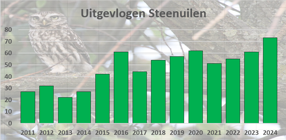 Jaarlijks bezoeken we de adressen twee keer. In het voorjaar voor nestcontrole en in de zomermaanden voor het eventueel herstellen en schoonmaken van de kasten. In totaal worden door het IVN 60 locaties gecontroleerd. Hier hangen 55 nestkasten en er zijn 4 vrije broedgevallen. In dit gebied zijn er tussen de 35 en 40 territoria. In geheel Sint- Oedenrode hangen ongeveer 70 kasten, waarvan er 27 bezet zijn door de steenuil. Alle overige kasten zijn meestal bewoond door spreeuwen (70%) en soms door een kauw.