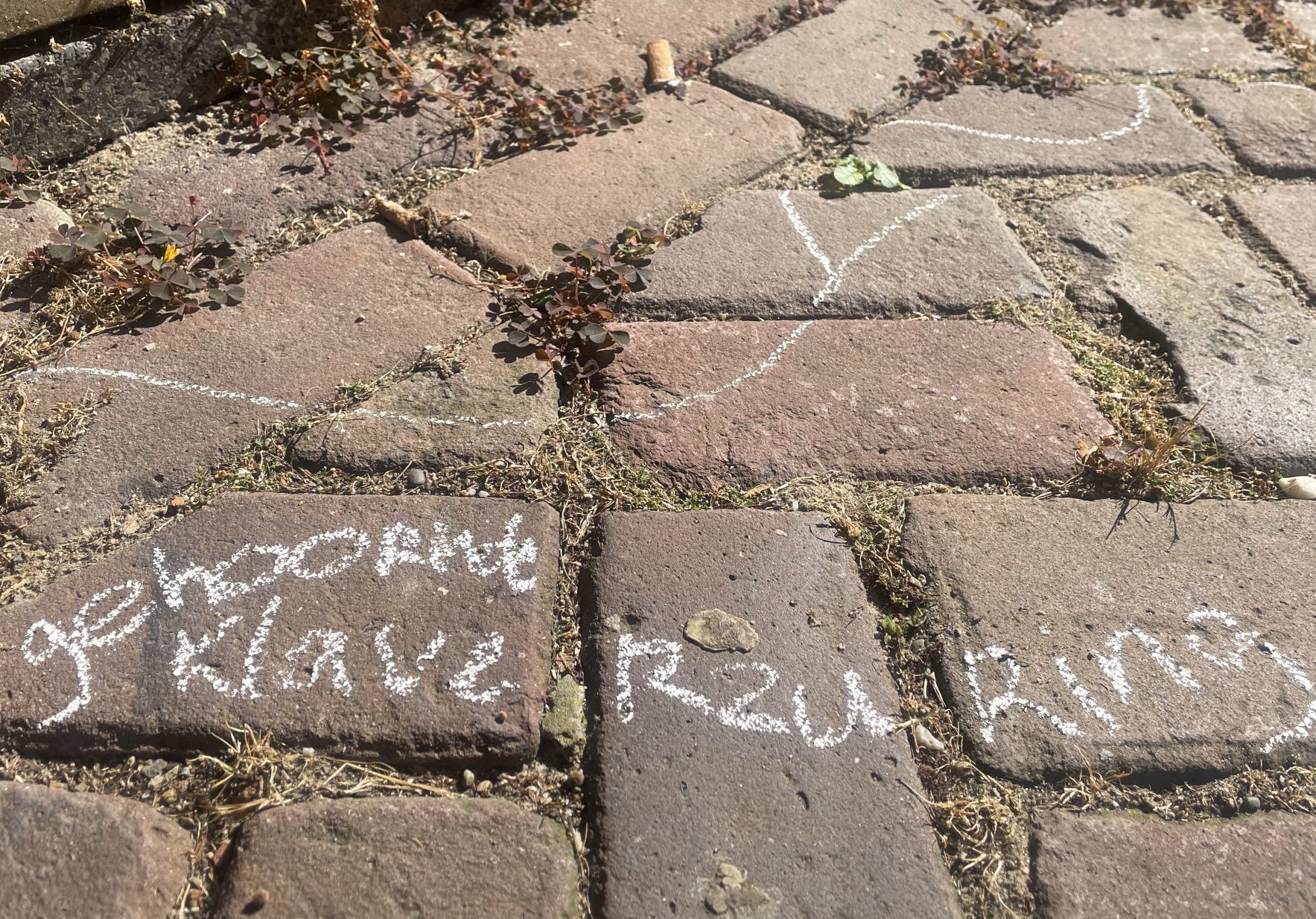 Stoeptegel met krijttekst en tekeningen, gras en onkruid zichtbaar tussen de voegen.
