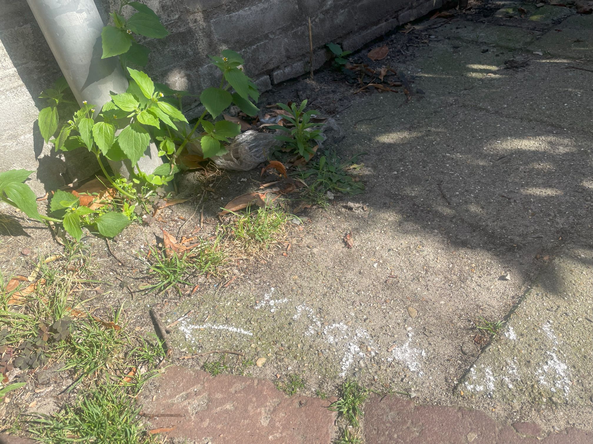 Stoeptegels met witte krijttekst “Grote Weelde” en omringend onkruid en bladeren.
