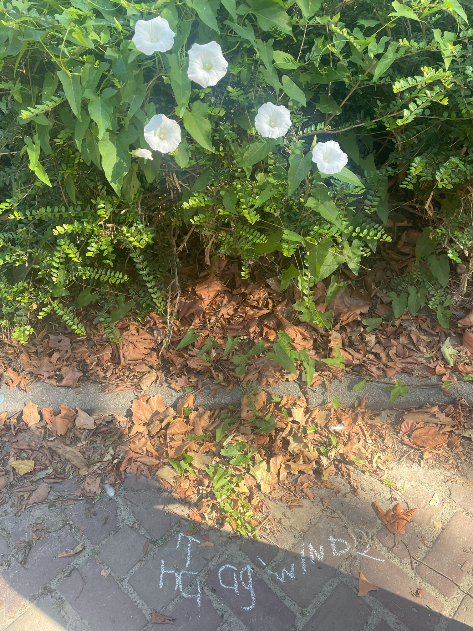 Groene struik met witte bloemen en krijttekening op trottoir, omringd door herfstbladeren.