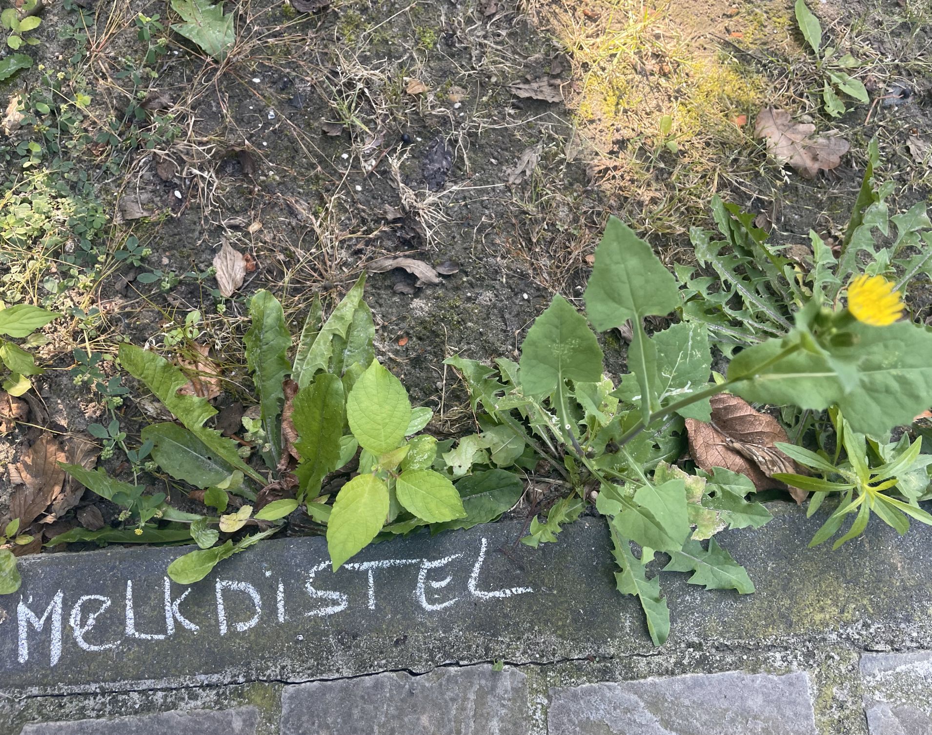 Melkdistel met gele bloem groeit langs een stoeprand, geschreven tekst “Melkdistel” eronder.