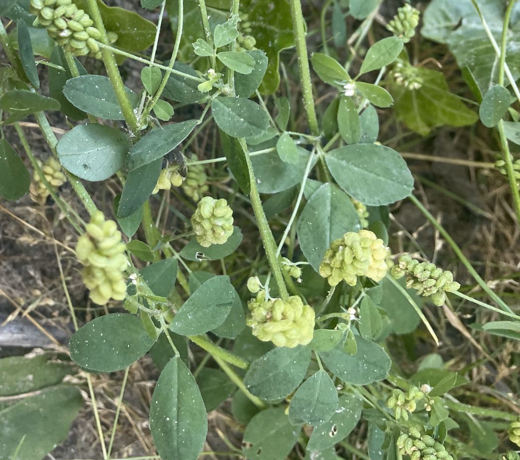 Groene plant met bolvormige knoppen langs een stengel tegen een wazige, natuurlijke achtergrond.