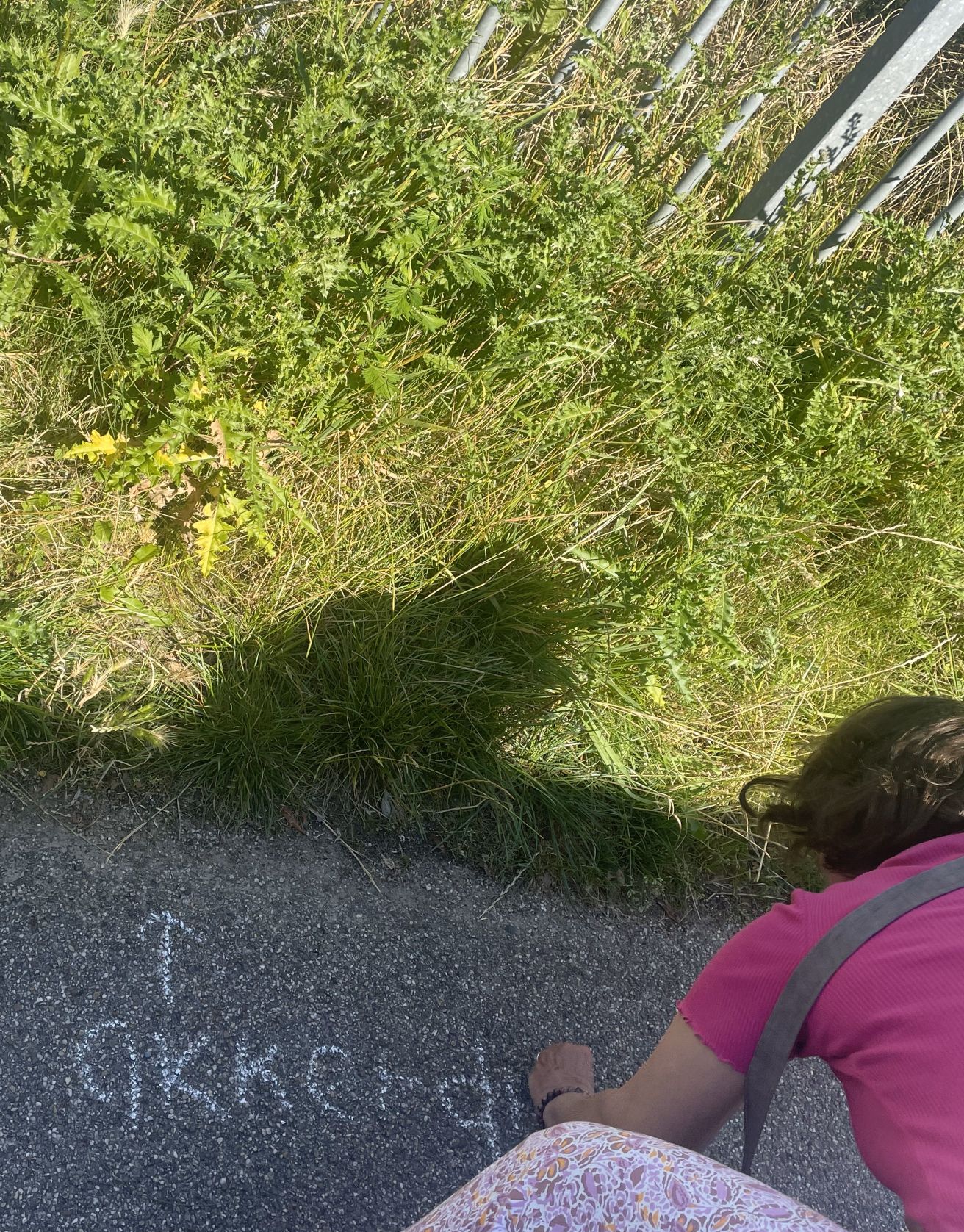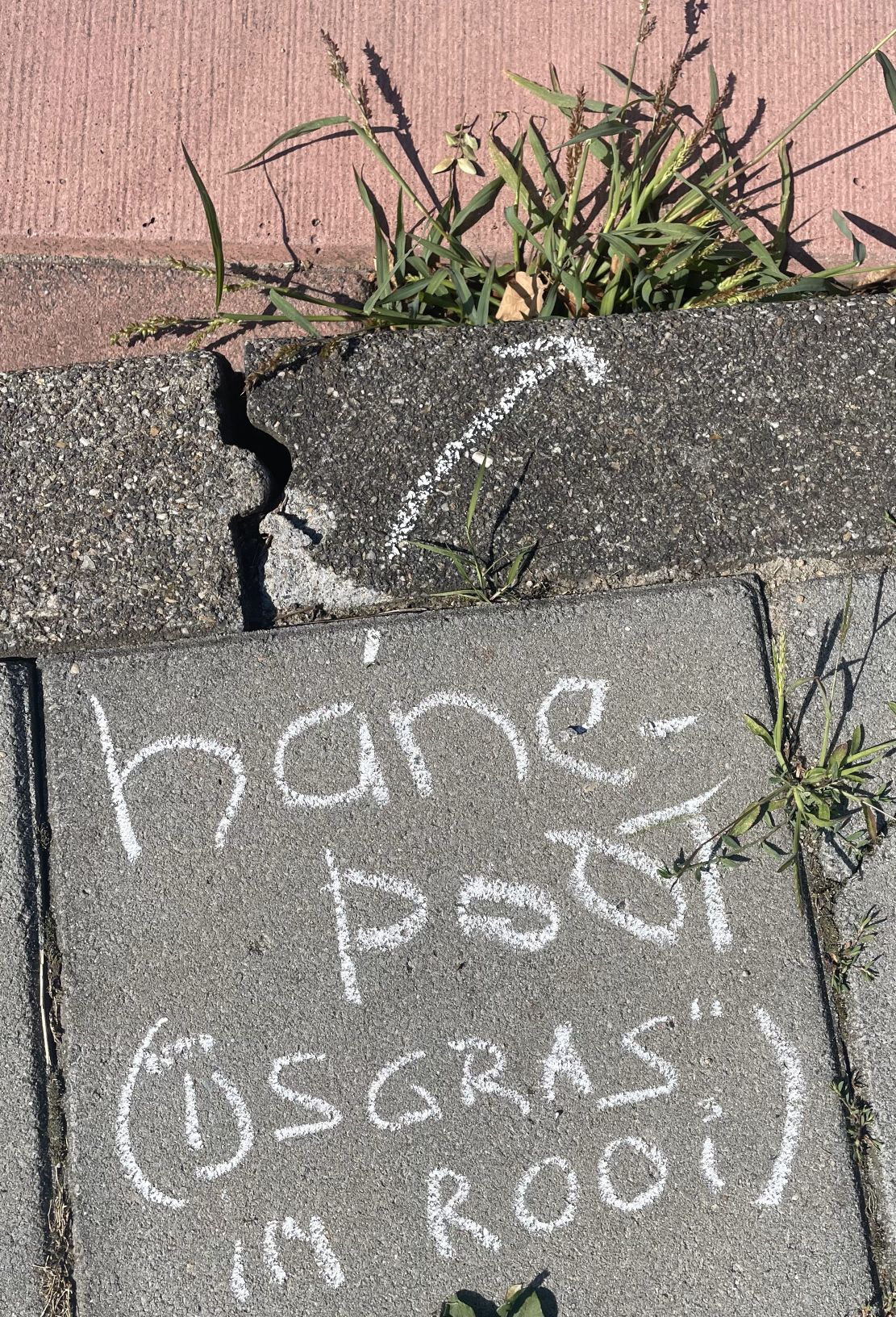 Groen gras en een struik langs een stoep met in krijt geschreven tekst op het asfalt.