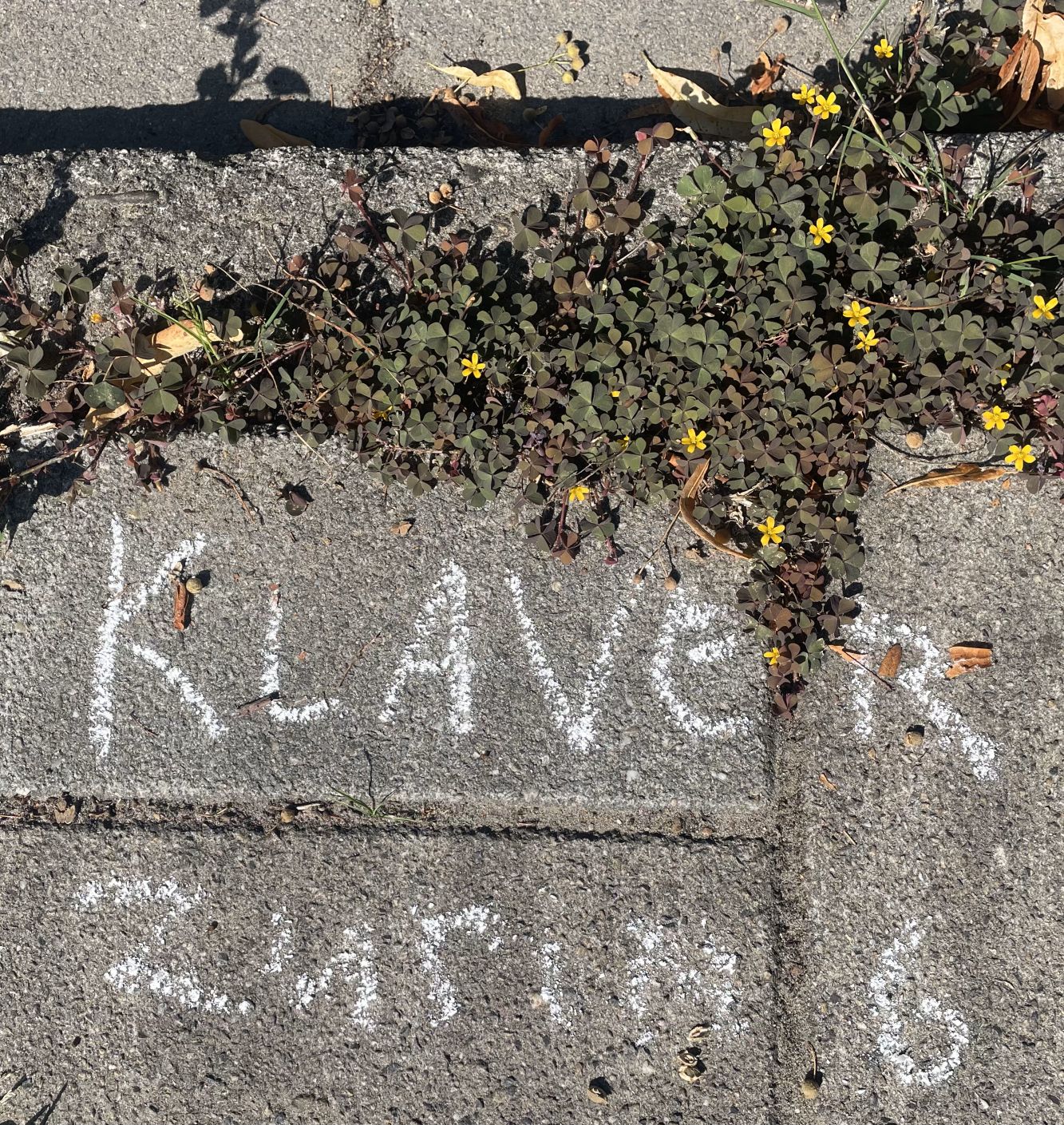 Kleine gele bloemen met “KLAVER zuur” in krijt op stoep geschreven.