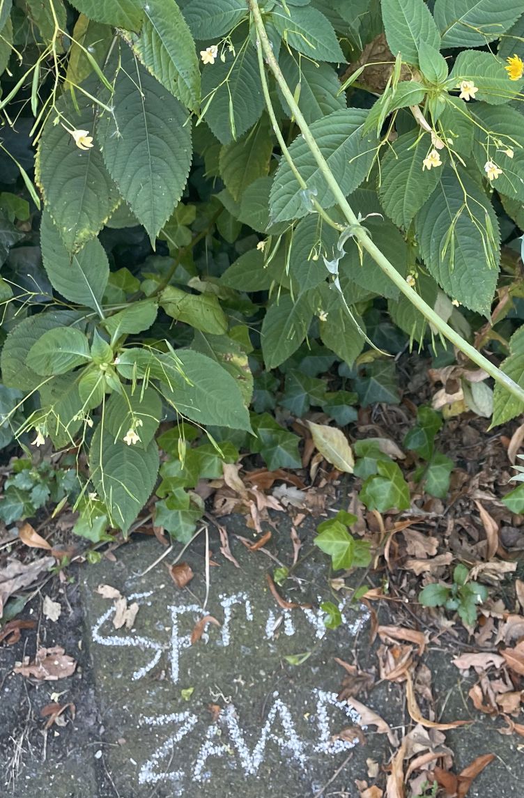 Groene bladeren boven een stoeptegel met krijttekst: “Spruw Zaad.”