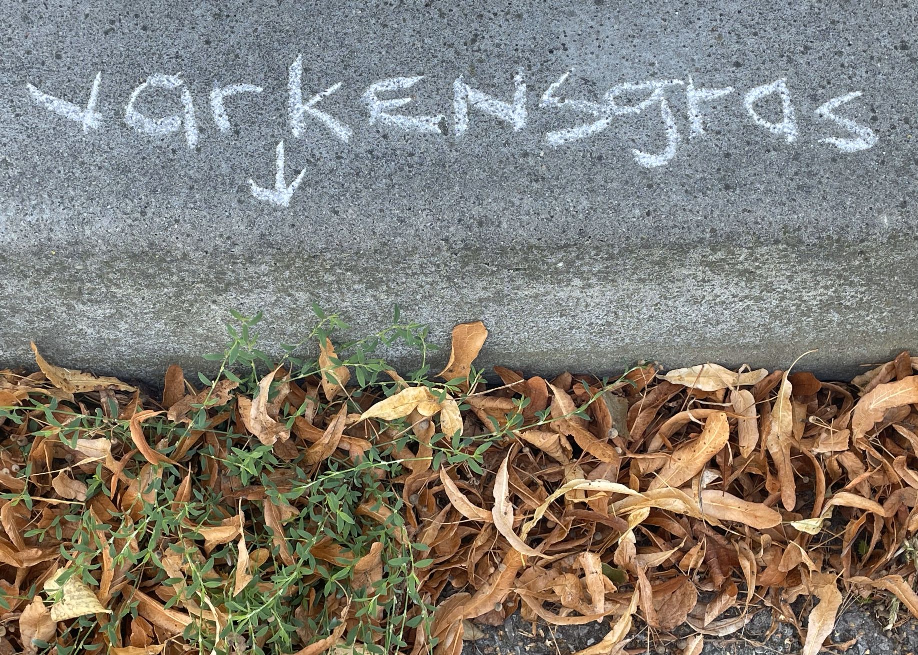 Krijtlabel “varkensgras” met pijl op stoepsteen, boven droog blad en groene plant.