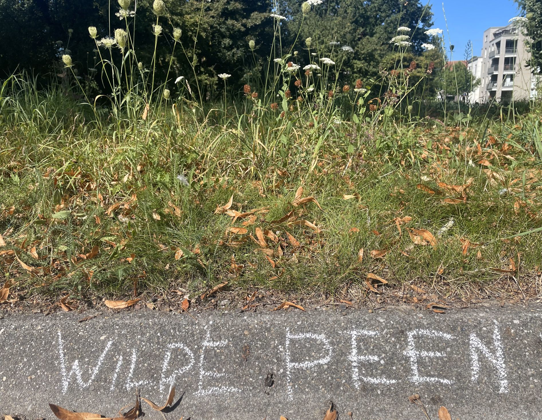 Wildflowers groeien naast de stoep met “WILDE PEEN” op het trottoir in krijt geschreven.