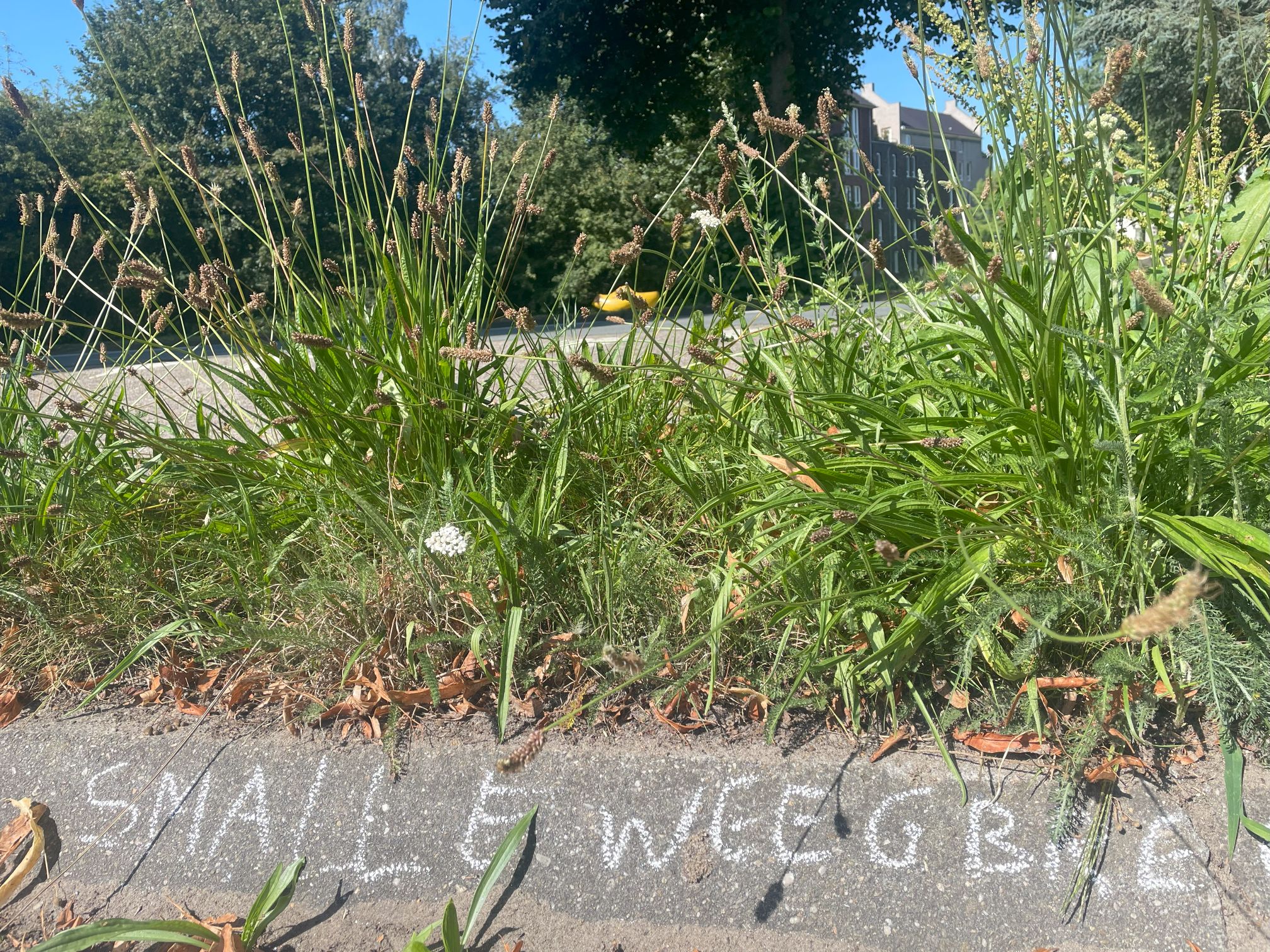 Weelderig gras met tekst “SMALLE WEEGBREE” op de stoep, zonnige dag met bomen in de achtergrond.