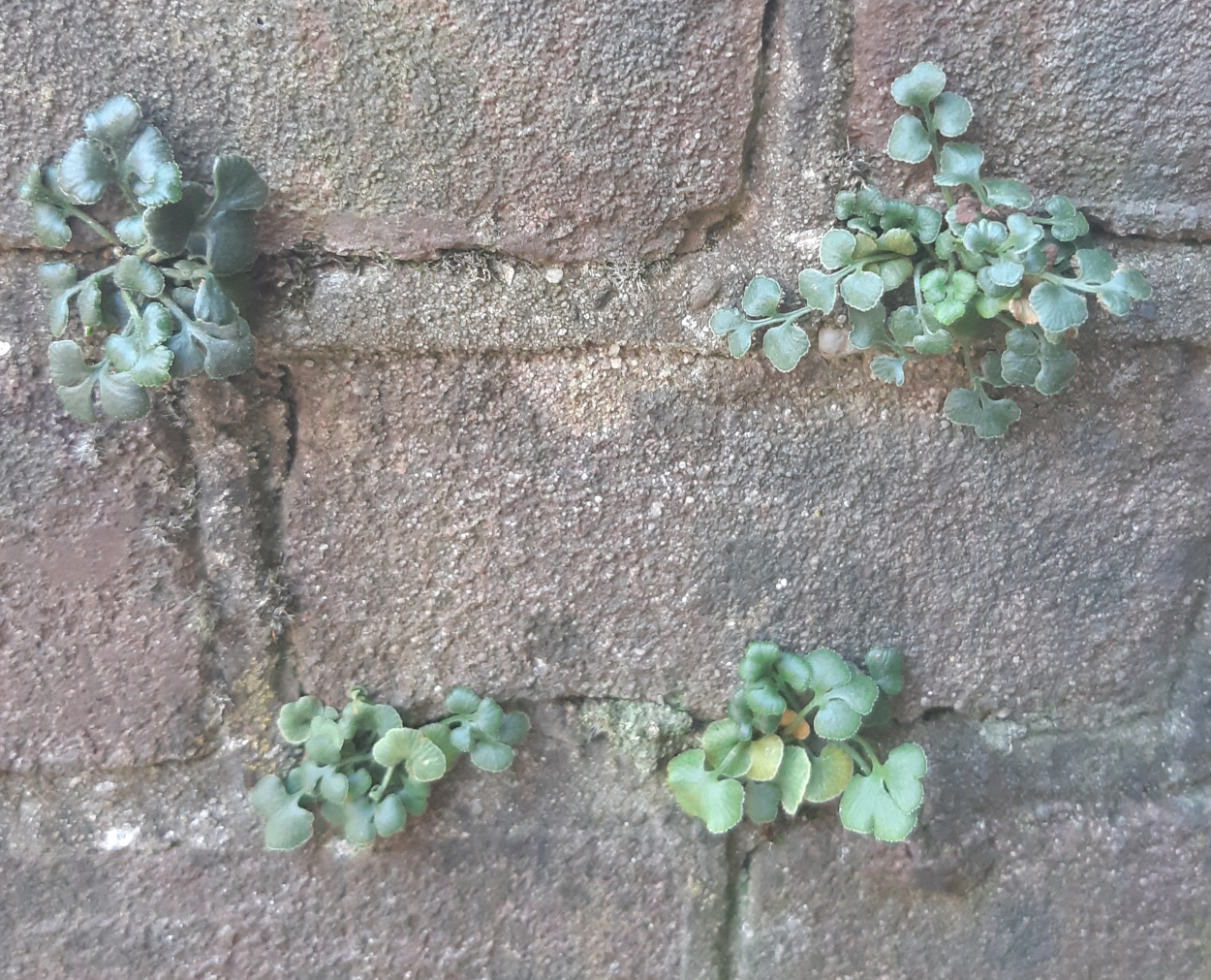 Kleine groene plantjes groeien tussen de voegen van een bakstenen muur.