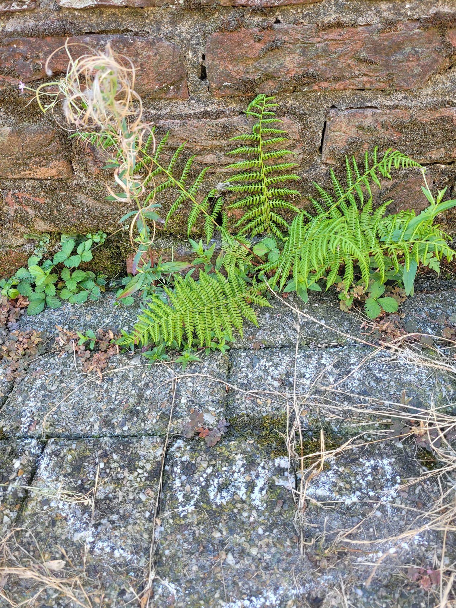Plantengroei tegen een oude bakstenen muur met varens en droog gras op de grond.