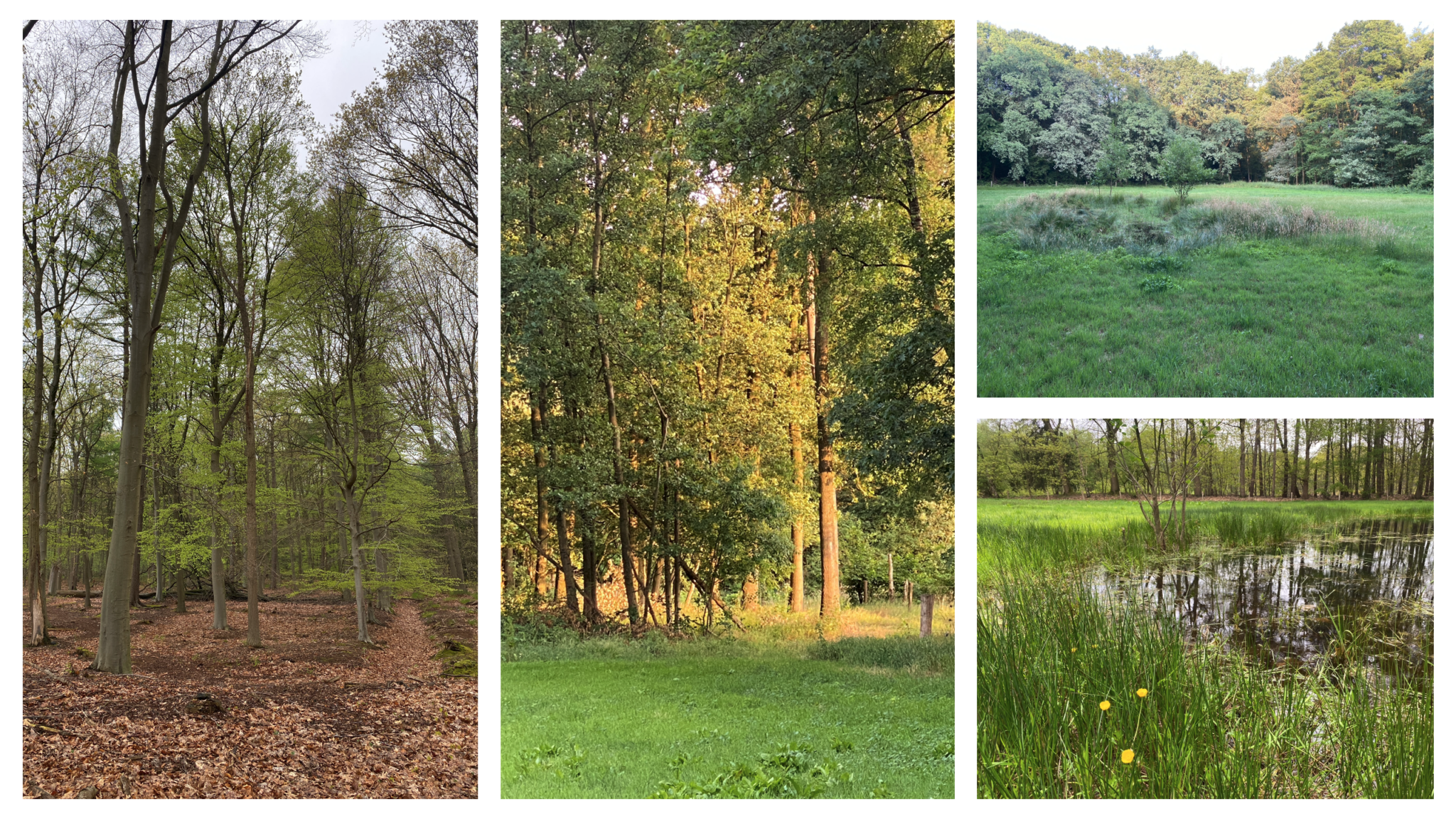 Vier foto's van boslandschap: bomen, grasveld en vijver met riet en bloemen.