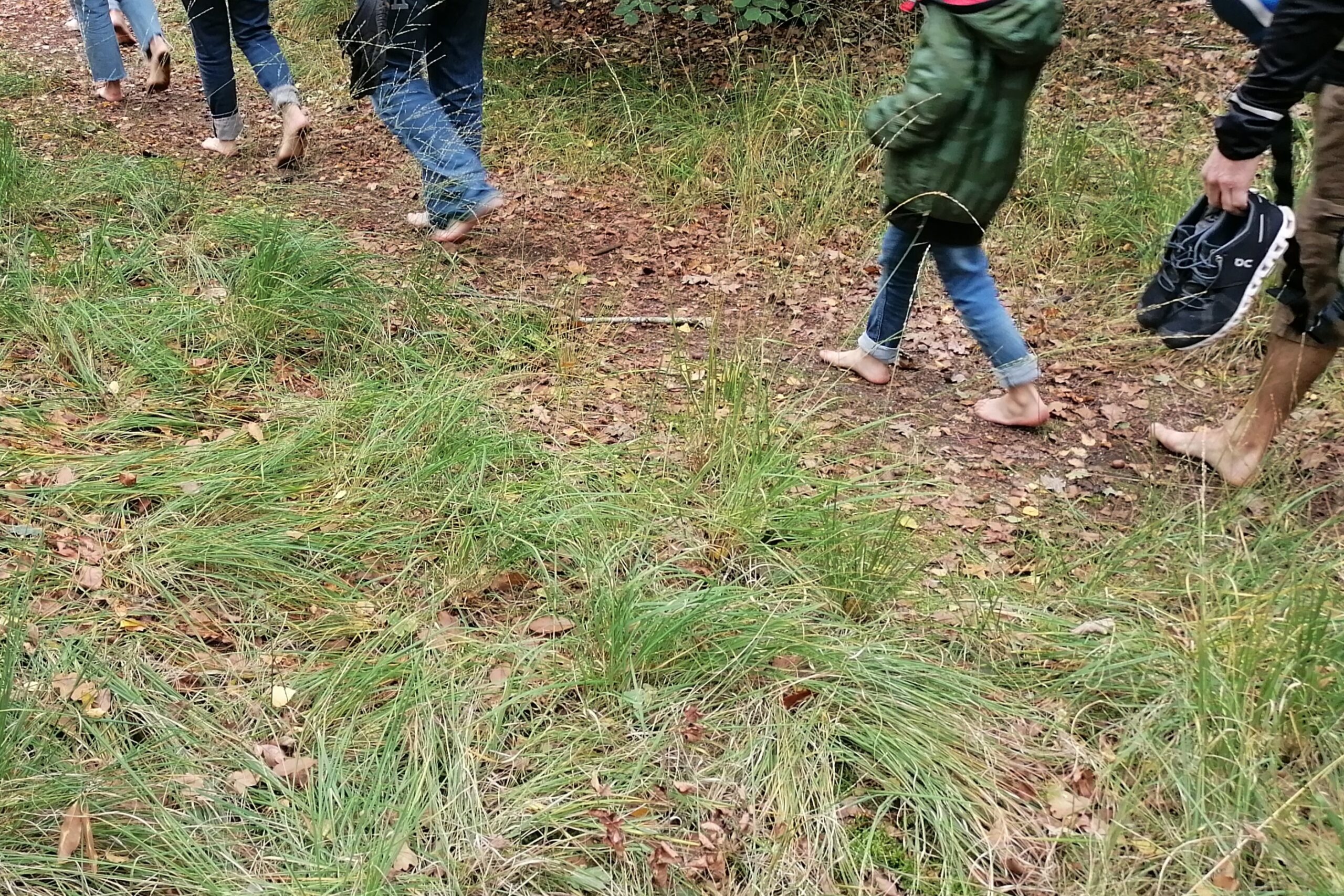 Al snel ontdekten de deelnemers hoe verschillend het bos kan voelen: het zand, het wat warmere tapijt van dennennaalden, het koelere gras, de zachte herfstbladeren en hier en daar een prikkelende dennenappel onder de voet.