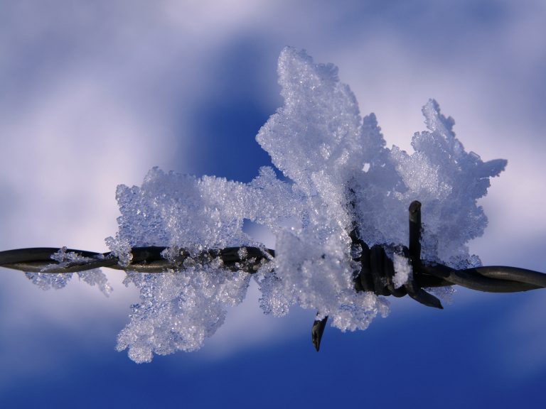 Bevroren ijskristallen op prikkeldraad tegen een blauwe achtergrond.
