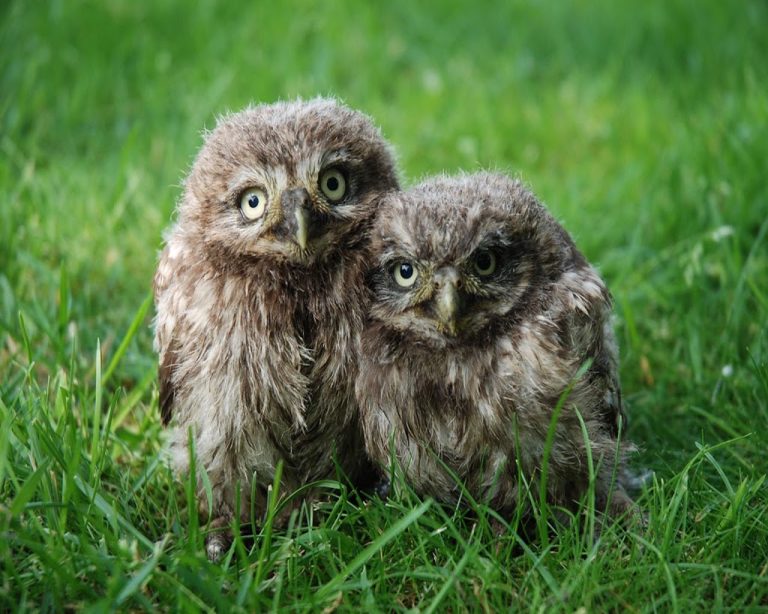 Twee jonge uilen zitten samen op gras; ze kijken nieuwsgierig rond.