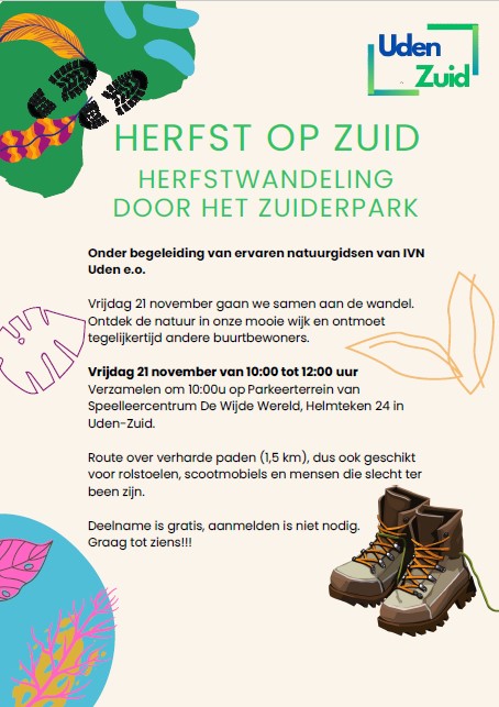 Op vrijdag 21 november verzorgen gidsen van IVN Uden eo op verzoek van Inwonersplatform Uden-Zuid een herfstwandeling door het Zuiderpark en het naastgelegen landschapspark De Meulenreek. We starten om 10.00 uur op het parkeerterrein van Speelleercentrum De Wijde Wereld, Helmteken 24 in Uden-Zuid en zijn rond 12.00 uur weer terug. De route gaat over verharde paden en is dus ook toegankelijk voor rolstoelen en mensen die slecht ter been zijn. We staan regelmatig stil, dus de route is maar kort (ongeveer 1,5 kilometer). Aanmelden is niet nodig en deelname is gratis.