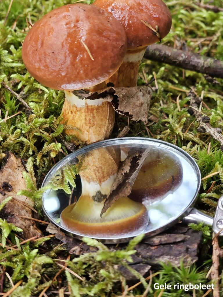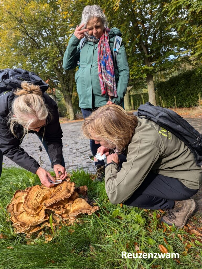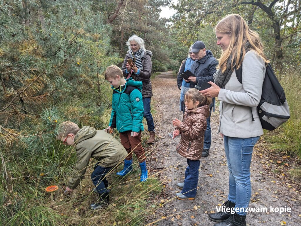 Ondanks de weersvoorspellingen en de vele paddenstoelenwandelingen in de omgeving zijn er toch een dertigtal mensen gekomen. We verdelen ze in kleine groepjes van vijf tot zes personen, ieder met een eigen gids. Petra neemt de kinderen mee en gaat gewapend met extra spiegeltjes en zoekkaarten op pad. Ze vonden het schitterend.