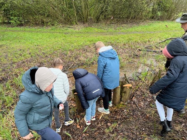 Gelukkig is de regen snel voorbij en op de route komen nog heel veel leuke onderwerpen voorbij zoals hoe werkt voortplanting bij kikkers en hoe zit een voedselketen in elkaar. Bij de afgezaagde wilgen vertellen we over hoe een boom groeit en natuurlijk bepalen de kinderen met behulp van de jaarringen de leeftijd van de bomen. Terwijl we de schilferige schors van een grove den bekijken vraagt een meisje serieus: ”Waarom mag een boom nooit naar school?” Heel droog geeft ze zelf het antwoord: “Hij wordt steeds geschorst!” Lol! We horen tijdens de route verschillende vogels zingen. Ook de tjiftjaf zit erbij en ze hebben al snel door hoe deze vogel aan zijn naam komt. Bij de bomen die vol in bloesem staan bekijken we de bloemen in detail met een loep. De kinderen weten te vertellen hoe belangrijk bijen en andere bestuivers zijn. Vervolgens laten we zien hoe dit bloemetje zal uitgroeien tot een mooie appel.