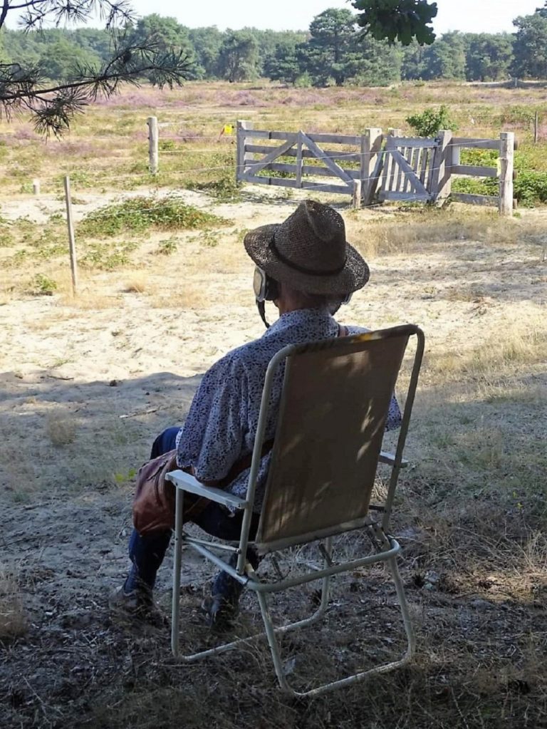 Een kleine dertig genodigden trotseren de tropische warmte en worden door Marc met open armen, (koele) drankjes en taart ontvangen op een schaduwrijke plek aan de rand van de paars gekleurde heidevlakte. Hij geeft in zijn openingswoordje een korte toelichting hoe een en ander in zijn werk ging totdat na een jaar de podcast klaar was. En de componist van de prachtige achtergrondmuziek, Bart van Dongen, vertelt hoe hij die vorm heeft gegeven.