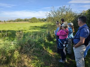 We komen ook langs een watertje waar de bever actief is, zo dicht bij de stad. Wonderlijk. Groep 1 heeft het geluk om daar een ijsvogeltje te zien, een prachtig kleurrijk vogeltje. Verder zien we nog een roodborsttapuit en fazanten. Deze zijn door de Romeinen meegebracht. Het is eigenlijk een zuidelijke vogel, maar hij heeft zich hier redelijk kunnen handhaven. Verder zien we een rietgors, die voor ons op het pad poseert en horen we regelmatig de Cetti’s zangers, die hier dus ook nog voorkomen. Voor de blauwborst zijn we te laat. Deze is reeds aan de trek begonnen. In het voorjaar en de zomer heb je veel kans om die hier te spotten.