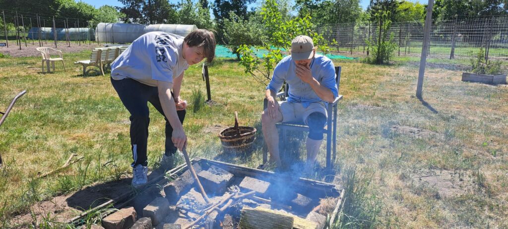 Terwijl de ene groep zich stortte op het snijden van groenten, plukte de andere brandneteltopjes. Daarna werden er twee vuren opgestookt, al bleek dat nog best een uitdaging. Van een klein vlammetje naar een goed smeulend vuurtje vraagt geduld, droge takjes en wat improvisatietalent. Maar het lukte. Al snel werden knakworsten en het meegebrachte brooddeeg boven de kolen geroosterd. Les van de dag: boven de vlam krijg je zwart brood, boven de kooltjes wordt het mooi bruin en knapperig.