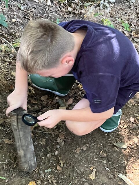 Daarna richtten we onze aandacht op de wereld dicht bij de grond. Onder oud hout, tussen de bladeren en in de aarde ontdekten de kinderen allerlei kleine bewoners. Zoals pissebedden met hun harnasachtige pantser en wiebelende voelsprieten, maar ook wormpjes en spinnetjes en zelfs een eikeldopje met piepkleine paddenstoeltjes én een mini-huisjesslakje. Met de loep zagen we zelfs de oogjes op steeltjes. Wat een ontdekking!