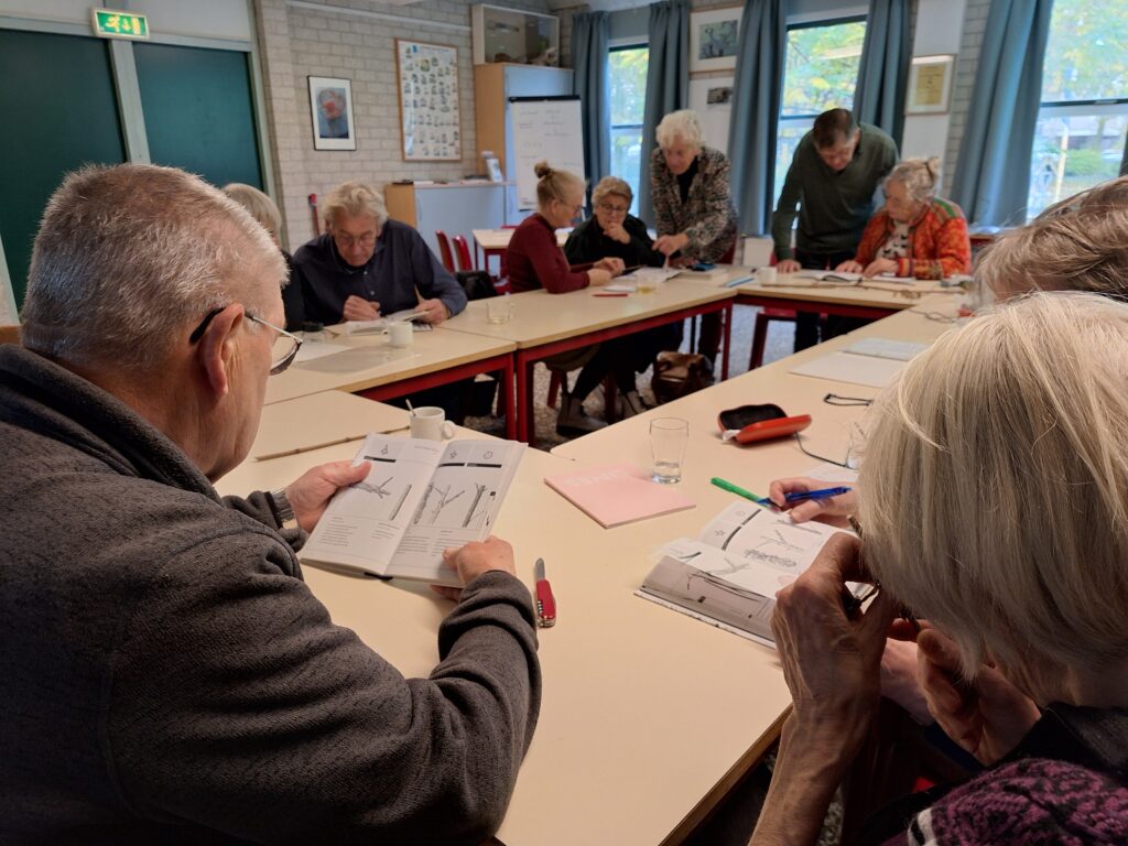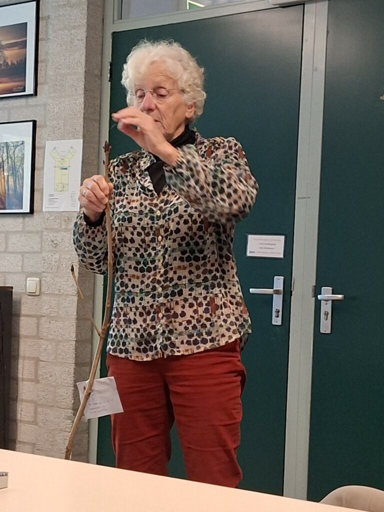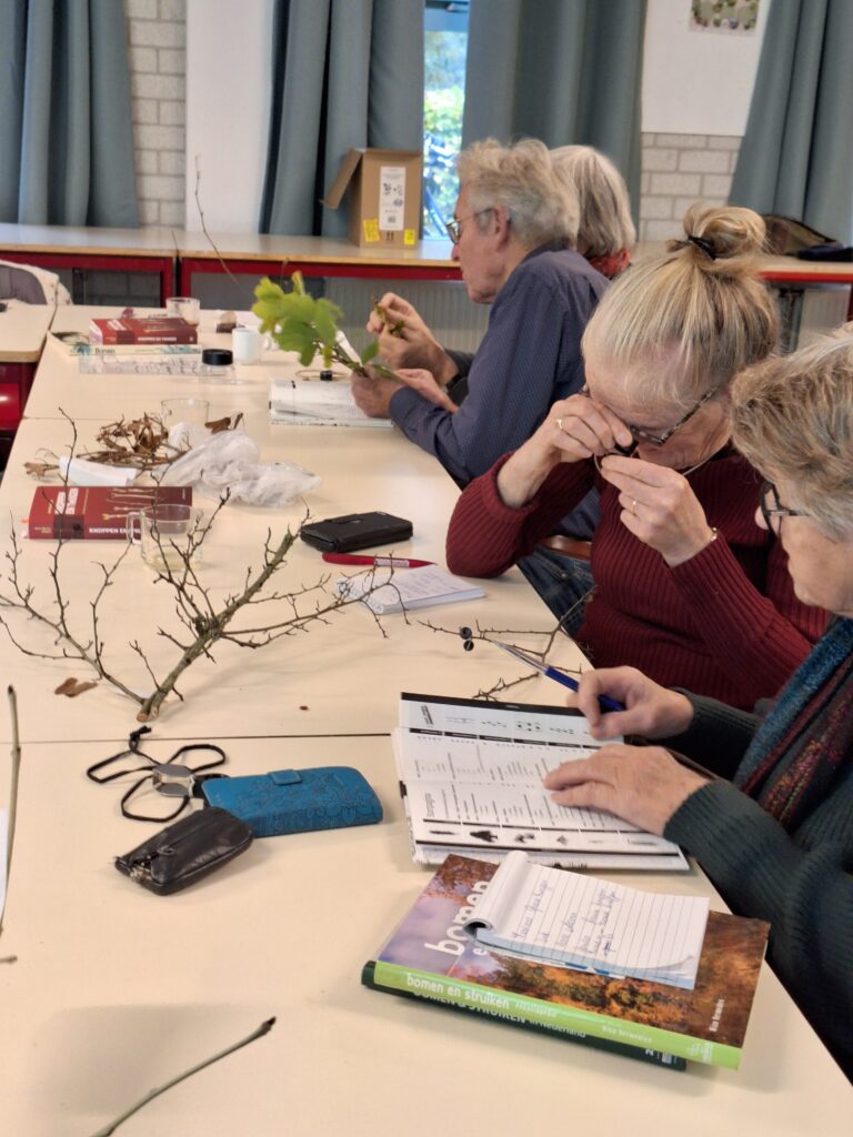 Na uitgebreide voorbereidingen pakt Anneke op dinsdagochtend 12 november in de Groenhoeve de koe bij de hoorns. Zij heeft een mooi groepje deelnemers van de Plantenwerkgroep verzameld en enthousiast gemaakt om te oefenen met determineren van knoppen en takken.