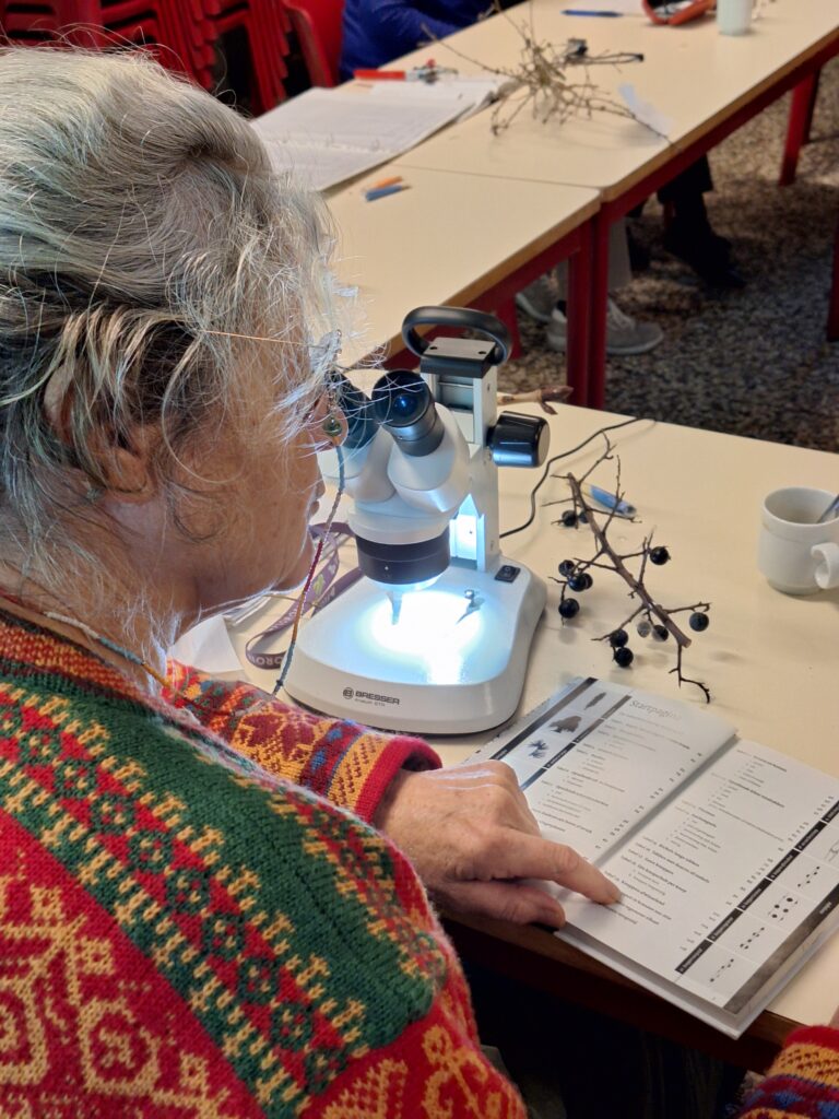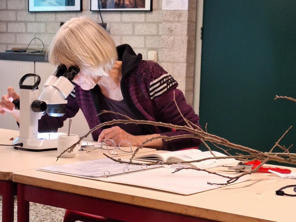 Een flinke voorraad oefenmateriaal, microscopen en boeken zijn uitgestald. En niet onbelangrijk, de koffie en thee staan klaar. Met potlood en papier, loepjes en het boekje Winterflora – waarmee 120 soorten bomen en struiken in hun winterstand op naam gebracht (zouden moeten…) kunnen worden – zitten we rondom Anneke. Ze start met een korte inleiding over het doel van deze ochtend. En knoopt er gelijk het omgaan met de determineersleutels in het boekje van Dirk Slagter aan vast.