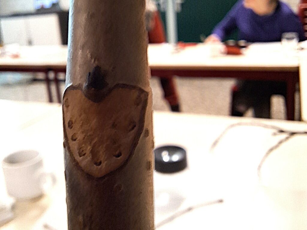 De aangeboden takken volgen elkaar in rap tempo op. Ingespannen gezichten, ogen die door loepjes en microscopen turen, vertwijfeld gezucht; Anneke staat alle groepjes gelukkig met raad en daad bij. Ze laat triomfantelijk de kale takken van de wilde en de tamme kastanje rond gaan: “Kijk naar de vorm, de grootte en de stand van de knoppen! Zó verschillend!” Een duidelijk en mooi voorbeeld van een bladlitteken, ook een determinatiekenmerk, is op de tak van de paardenkastanje te zien.