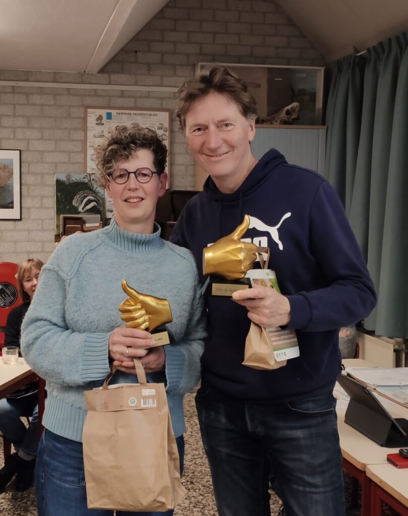 Dat kun je natuurlijk niet bereiken zonder actieve leden, vandaar dat we twee personen hebben benoemd tot ‘IVN’er van het jaar 2024’. Zowel Adriëtte als Twan hebben een tomeloze inzet getoond op hun eigen ‘vakgebied’. Adriëtte in de vormgeving van diverse projecten en Twan als projectleider voor nieuwe activiteiten voor jeugd en jongeren. Beiden waren zeer verrast om ‘een dikke duim’ te krijgen.