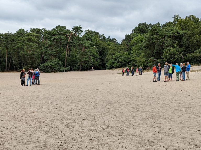 Na wat gepuzzel over de beschikbare tijd en het daarin haalbare aantal kilometers en toelichtende praatjes kwamen we bij het voorwandelen met Paul, Hans, Ria, Toine en mij tot een soort ingekorte versie van de Berg- en Breukroute. Zo hebben we toch de in de aankondiging beloofde thema’s Stuifduinen, Leijgraaf-beekdal en Peelrandbreuk aan bod kunnen laten komen en boden we de ongeveer 40 deelnemers een mooi gevarieerde wandeling op een bewolkte dag met toch fijn wandelweer.