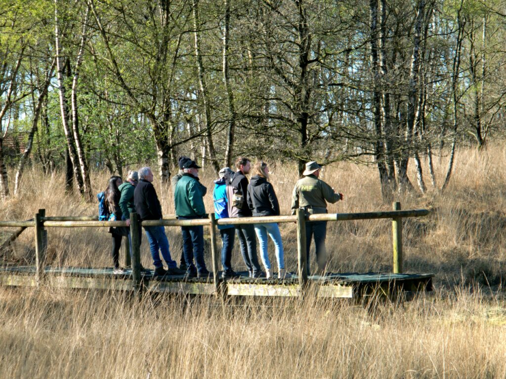 Op een stralende zondagmorgen 6 april meldden zich 38 bezoekers voor de Expeditie Voskuilenheuvel aan de Schepersdijk in Venhorst. Na een kort welkom namens IVN Uden e.o. kreeg Jan Manders het woord. Hij is één van de oprichters van het eerste uur van dit mooie gebied en nog altijd actief als voorzitter van het stichtingsbestuur van dit terrein. Hij nam ons mee op reis in de geschiedenis van de Peel, de ontginningen en het ontstaan van het landschapspark de Voskuilenheuvel in 1989. Dat dit gebied in het begin van de 20e eeuw te slecht was voor de landbouw, bleek uiteindelijk de redding voor dit pareltje natuur te midden van een intensief landbouwgebied. De terreineigenaar, gemeente Boekel, heeft het beheer van dit gebied in goede handen ondergebracht bij een actieve groep vrijwilligers van deze stichting. Zij zetten zich op heel wat van hun vrije zaterdagen in voor het voortbestaan van dit natuureducatiepark.