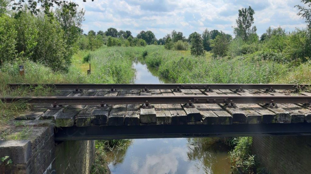 Voorbij het rangeerterrein volgen we het Duits Lijntje tot aan de Zuid Willemsvaart. Hier liggen de spoorrails nog. Over het kanaal nemen we afscheid van het Duits Lijntje. Met flinke tegenwind vervolgen we onze weg richting het Wijboschbroek. Dit is een laaggelegen waterrijk gebied, waar de kenmerkende populieren staan voor de klompenindustrie van Sint-Oedenrode van vroeger. Het is een prachtig gebied waar in het voorjaar de zeldzame Slanke Sleutelbloem veelvuldig bloeit en tevens de Bosanemoon en het Speenkruid.