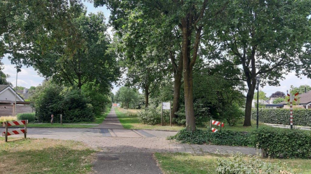 We vertrekken richting Zoggel, waar we voor het eerst de voormalige spoorlijn kruisen. De spoorrails in het wegdek en de andreaskruizen zijn verwijzingen naar het spoorlijntje, evenals het speeltuintje iets verderop. Opvallend dat een paar deelnemers dit nog nooit opgemerkt hadden. In het centrum van Uden is verder niets meer zichtbaar van het Duits Lijntje behalve een paar straatnamen, zoals het genoemd wordt.