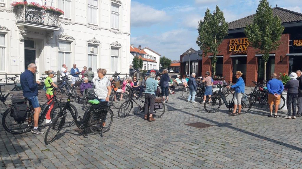 Op zondagochtend 16 juli om half 11 hebben zich 36 mensen verzameld om deel te nemen aan de fietstocht. Verdeeld in twee groepen vertrekken de deelnemers begeleid door Thea en Joep. Gelukkig zijn Chris en Lies erbij om de groepen van achter in de gaten te houden. Het is een winderige ochtend, maar bijna alle deelnemers fietsen elektrisch.