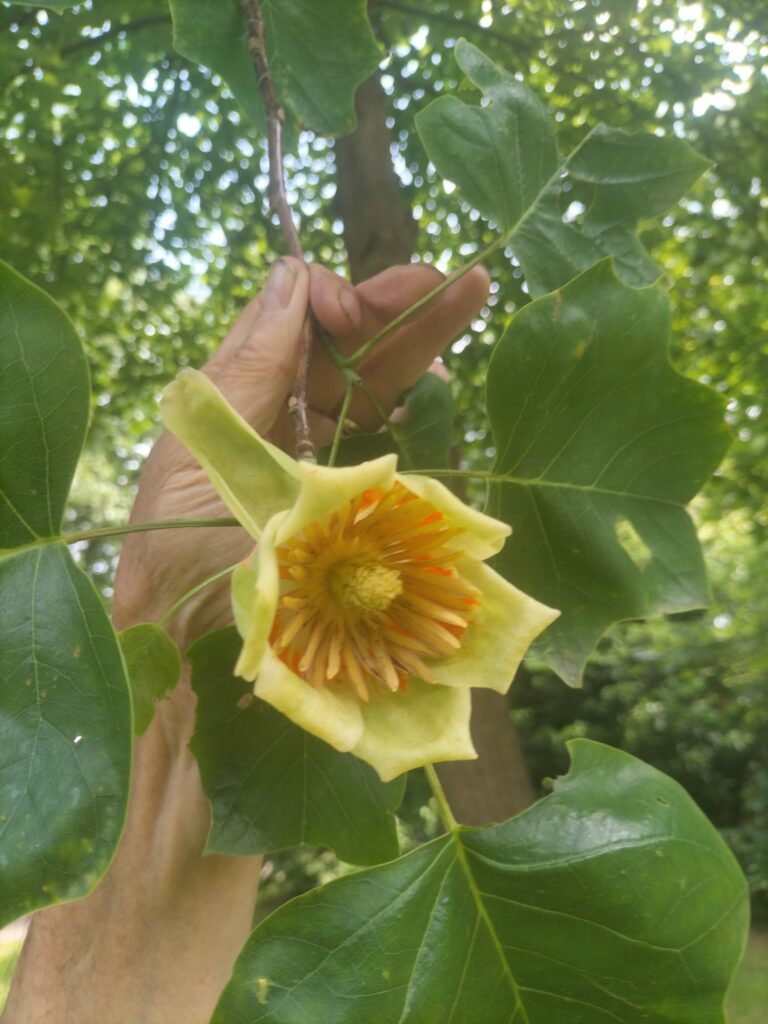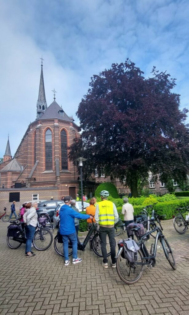 We gingen op pad in vier groepen onder begeleiding van de gidsen Lies, Jo, Chris en Joep. De tocht ging door de buurtschappen rond de kom van Uden en Volkel. Op verschillende markante plaatsen werd gestopt, zoals bij de Kruisherenkapel met de rode beuk die na de oorlog is geplant. Daaronder zit een koker met alle namen van de Kruisheren die daar toen woonden. Op het Lieve Vrouweplein is in 2019 een etagelinde geplant als teken van de verering van Maria Ter Linde. Bij het oude centrum van Uden, het Piusplein, zijn in 1935 paardenkastanjes geplant. Een aantal zijn gesneuveld door de bloederziekte, maar gelukkig hebben een groot aantal het overleefd. We fietsten door de Heinsbergenstraat en Hoevenseweg met zijn oude zomereiken. En door de Klantstraat, een oud buurtschap met veel boerderijen met de typische bomen als leilindes, walnoten en kastanjes. Verder langs het Mellepark en Raampark naar De Kleuter en buurtschap Lankes in Volkel, naar het Frankisch veldje aan de Antoniusstraat en Wilgenstraat. Daar werd vroeger vee bijeen gedreven en werden veekeuringen uitgevoerd. Nu staan er forse Amerikaanse eiken, paardenkastanjes en lindes. Door het buitengebied van Volkel naar de wijstgronden in Kooldert met zijn typische kleinschalige weilandjes en knotwilgen. Via buurtschap Eikenheuvel naar d’n Ujese Boogerd voor een korte lunchpauze. Helaas zijn de laatste jaren geen kersen geoogst vanwege de suzuki fruitvlieg. We vervolgden onze fietstocht door Uden-zuid naar het Zuiderpark, de Meulenreek en het Sportpark voor de laatste stop. Daar staan nog veel oude bomen, die daar door de paters van het Willibrordusklooster zijn aangeplant (in brand gestoken door de Duitsers in 1944). Verbaasde blikken toen we de echte tulpenboom lieten zien, die vol in bloei stond. “Vaak langs gelopen, maar nooit gezien,” merkte een van de deelnemers op. Iemand anders wilde de mammoetboom zien in het park. Zij had die ook gezien in Amerika. De boom die hier 50 jaar geleden geplant is kan natuurlijk niet tippen aan de exemplaren in Amerika, een teleurstelling. Rond 13.00 uur waren we weer terug op de Markt, net voor de hevige regen en de hagelbui. Waarschijnlijk zijn er toch nog een aantal deelnemers goed nat geworden. Zeker degenen die nog naar Odiliapeel, Heesch, Zeeland of Veghel moesten fietsen.