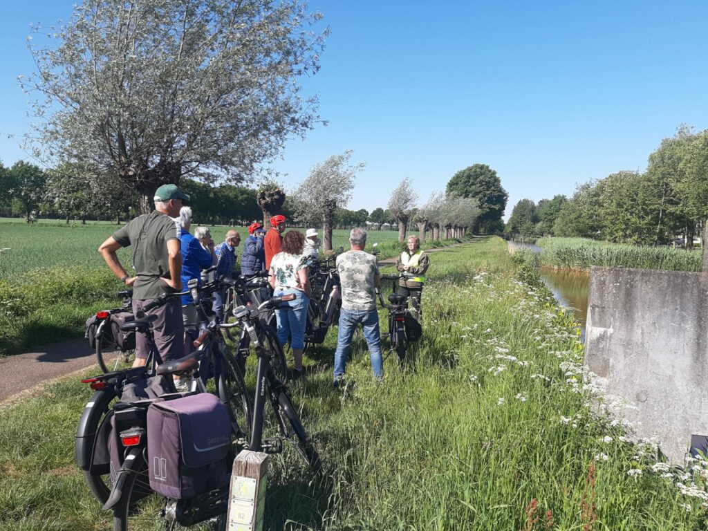 Rond 10 uur had zich op de Markt een mooi groepje verzameld van zo’n veertig geïnteresseerden. Met vijf gidsen, verdeeld in vier groepen, was dit een mooie grootte van ieder groepje. Nadat de voorste en achterste deelnemer voorzien was van een hesje, fietsten we richting Uden-Zuid. Daar hebben we even stilgestaan bij de keerwand die de Mellebreuk symboliseert. Vandaar naar Kooldert en langs vele poelen naar de Leijgraaf, die zijn oorsprong heeft in Erp bij buurtschap de Veluwe, als aftakking van de Aa. De Leijgraaf is door de eeuwen heen van enorm belang geweest voor de bewoners van Uden en omgeving. Sinds de oprichting van waterschap De Aa en de ruilverkaveling is het mogelijk om het water in de Leijgraaf beter te sturen, bijvoorbeeld door vele stuwen te plaatsen.