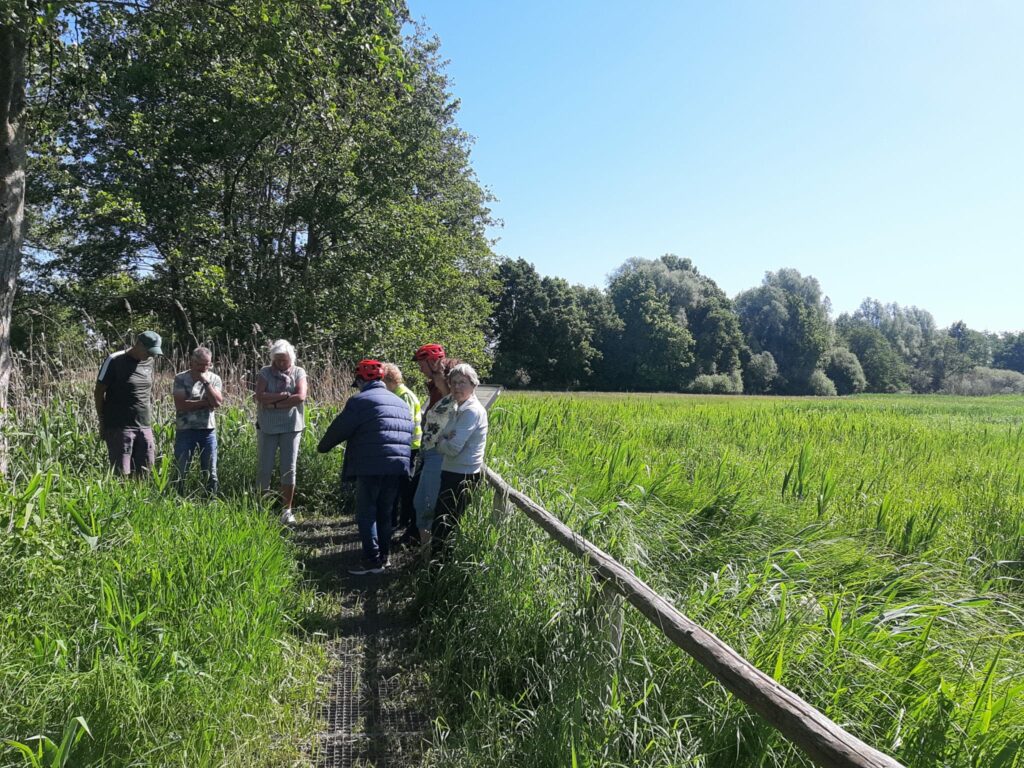 Voor vissen is dit een enorme barrière, die het waterschap oplost door gebruik te maken van onder andere vispassages, en soms door een vislift, wanneer er minder ruimte is. Elk voorjaar wordt de vistrap weer begaanbaar gemaakt, zodat vissen weer terug kunnen keren naar hun geboortegrond om daar te paaien. Nadat we de vistrap en de nabij gelegen EVZ hebben bewonderd, fietsten we verder langs recent aangekochte sVLU-percelen, die zich mooi aan het ontwikkelen zijn. Dan naar de Karperdijk voor wat uitleg over de Peelrandbreuk die zo kenmerkend is voor dit gebied. Via de Steeuwichtweg richting de Noordelijke Wijst. Natuurlijk even wat aandacht voor het fietspad dat nu gemaakt is van padvast, en voor de reuzebereklauw langs het fietspad in verband met de blote benen.